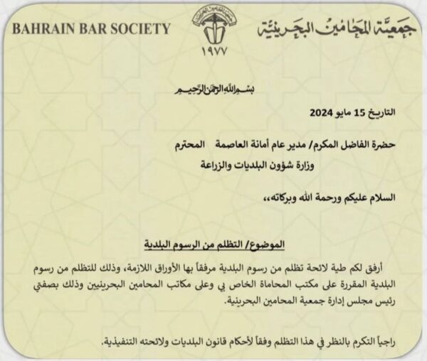 تقدمت جمعية المحامين البحرينية بتظلم إلى لجنة تظلمات الرسوم البلدية بأمانة العاصمة بشأن الرسوم البلدية