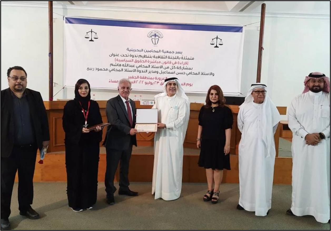 نظمت اللجنة الثقافية بجمعية المحامين البحرينية مساء يوم السبت 23/07/2022 بقاعة نادي العروبة بالجفير ندوة قراءة في قانون مباشرة الحقوق السياسية انتدى فيها كلاً من المحامي الأستاذ عبدالله هاشم والأستاذ حسن إسماعيل وكانت الندوة بإدارة الأستاذ محمود ربيع.